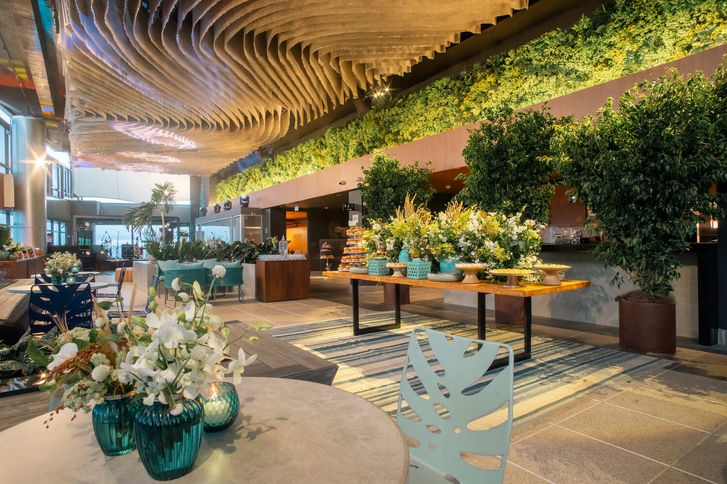 O design do teto reforça a amplitude do ambiente e valoriza sua imponência. O mobiliário exclusivo e a atmosfera intimista transformam o espaço em palco para casamentos, aniversários e festas de 15 anos que buscam marcar história.
